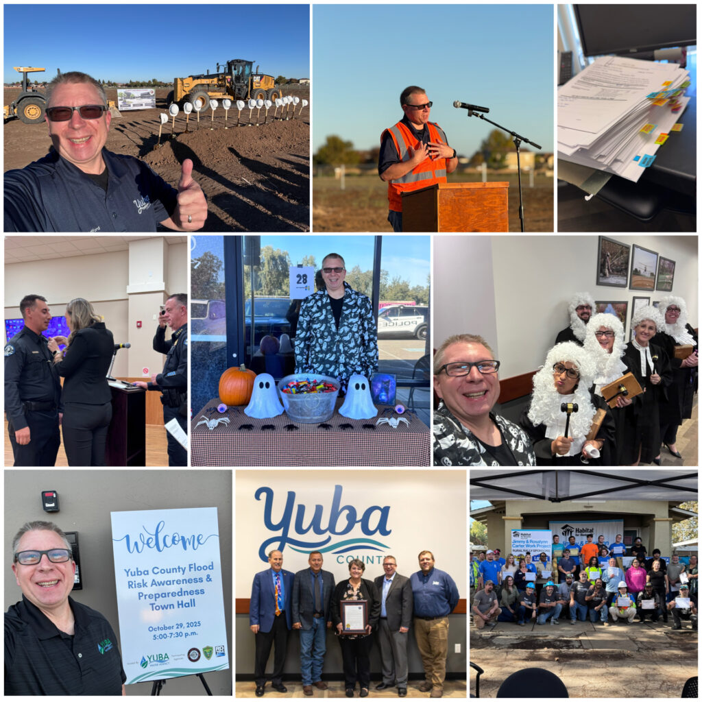 *The picture is a collage of various things from my week: Plumas Lake Middle School groundbreaking, post board meeting paperwork to sign, swearing in of Wheatland PD’s newest officer, Wheatland Safe Trick or Treat, Yuba County Counsel office’s entry in the employee costume contest, Yuba County Flood Risk Awareness & Preparedness Town Hall, honoring Tina Taylor upon her retirement after 34 years of outstanding service to the community, and the Habitat Rural Rally Closing Ceremonies.