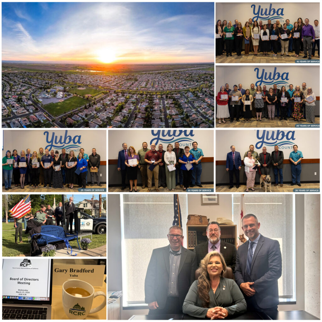 *The picture is a collage of various things from my week:  Sunrise of Plumas Lake (photo by Glenn Robinson); Board of Supervisors honoring Yuba County employees for 10, 20, 25, 30, and 35 years of service; dedication of a memorial bench for Officer Rodarte in Marysville; representing Yuba County at an RCRC board meeting; and Yuba, Glenn, and Tehama advocating for state funding for rural counties to support the County Medical Services Program to offset significant additional county costs resulting from H.R.1.